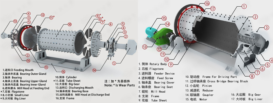 昆重礦機生產(chǎn)的濕式溢流型球磨機是由進料器、出料器、軸承座、端蓋、法蘭盤、筒體、大齒輪、傳動總成(減速機、小齒輪、聯(lián)軸器、電機)等部件組成。襯板采用13錳鋼耐磨料,具有耐磨及防腐特點。